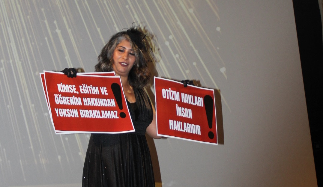 Geceyi organize eden Ayar Dergisi İntiyaz Sahibi Gazeteci Dilek Bozkurt sahneye elinde " Kimse, eğitim ve öğretim hakkından mahrum bırakılamaz ve Otizm Hakları İnsan Haklarıdır" pankartıyla çıktı.